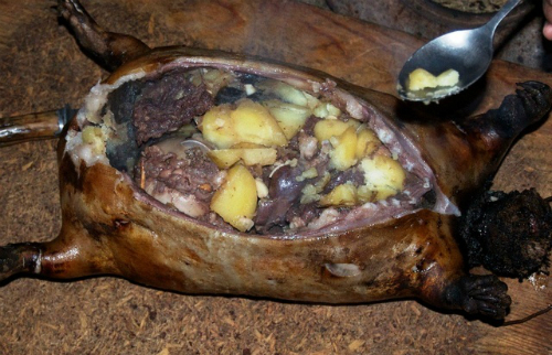 Sau đó người ta nhồi muối, ớt bột, tiêu, hành củ, khoai tây, gan, cật, thịt dê thái miếng và đá đã được nung kỹ vào “chiếc túi da dê”. Đá phải được làm sạch, bề mặt trơn nhẵn và tròn. Đá nhỏ thì được nhồi vào tứ chi, đá to được nhồi vào khoang bụng. Cứ một lớp đá nóng lại đến một lớp nhân thịt và rau củ cho đến khi túi đầy.