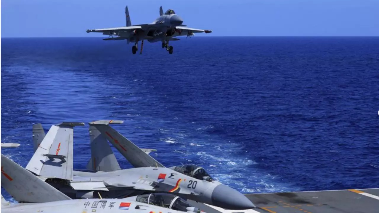 Chiến đấu cơ J-15 trên tầu sân bay Liêu Ninh (Liaoning) của Hải Quân Trung Quốc tập trận ngoài khơi. Ảnh đề ngày 31/12//2021 của Tân Hoa Xã. © AP / Xinhua