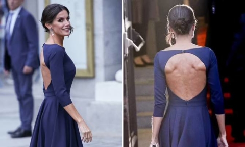 Hôm 24/10, Hoàng hậu Letizia thu hút ánh nhìn khi cùng chồng tham dự lễ khánh thành The Royal Theatre Season ở Madrid. Bà mẹ hai con diện chiếc váy màu xanh navy thắt eo, với chi tiết chân váy xếp nếp. Đặc biệt, chiếc váy kín đáo ở trước, nhưng hở ở phía sau, khoe trọn tấm lưng săn chắc không mỡ thừa của hoàng hậu Tây Ban Nha.