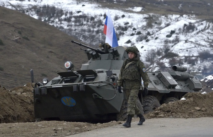 Lính gìn giữ hòa bình Nga làm nhiệm vụ tại chốt kiểm soát vùng Nagorno-Karabakh, khu vực tranh chấp giữa Azerbaijan và Armenia, vào tháng 11/2020. Ảnh: AFP.