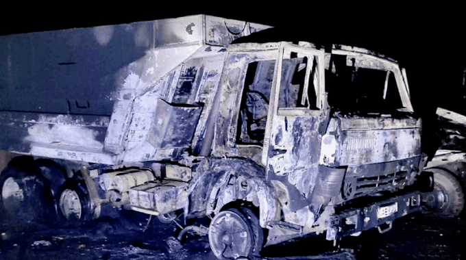 Một xe tải bị cháy rụi sau trận pháo kích của Nga vào thành phố Nikopol (Ảnh: Telegram).