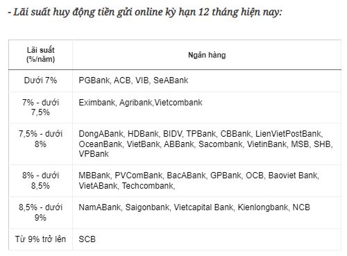 Theo khảo sát của Zing, một loạt ngân hàng thương mại tư nhân như Kienlongbank, Saigonbank, Techcombank, VietABank, Baoviet Bank, OCB, GPBank, BacABank, VPBank, MBBank, Sacombank, SHB… đều đang có mức lãi suất tiền gửi tối đa trên 8%/năm, chủ yếu tập trung ở kỳ hạn 12 tháng trở lên.