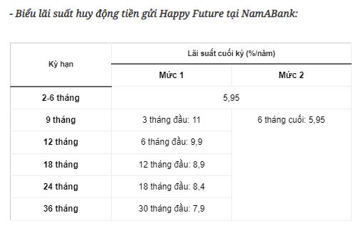 Cụ thể, nhà băng này đang áp dụng chương trình huy động tiền gửi Happy Future với biểu lãi suất phân kỳ. Trong đó, tại kỳ hạn 9 tháng, khách hàng gửi tiền vào NamABank sẽ nhận được mức lãi suất lên tới 11%/năm trong 3 tháng đầu, trong 6 tháng tiếp theo, lãi suất sẽ được điều chỉnh về mức 5,95%/năm.