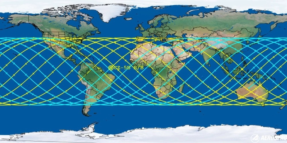 Đường rơi dự kiến của mảnh vỡ tên lửa Trường Chinh-5B. Các vị trí tên lửa tái nhập có thể ở bất kỳ đâu giữa đường màu xanh và màu vàng. (Ảnh: Aerospace Corporation)