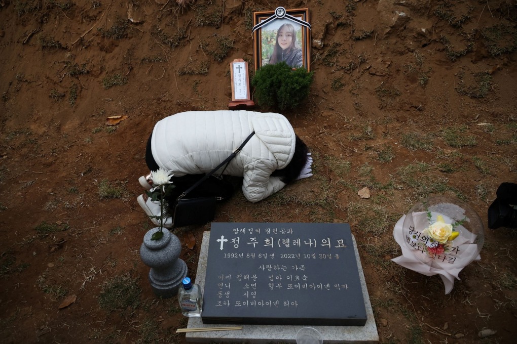 Bà Lee Hyo-sook, 61 tuổi, khóc trước mộ con gái Joo-hee, 30 tuổi, ở Namyangju, ngoại ô Seoul, ngày 3/11. Ảnh: Reuters.