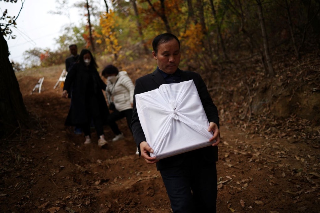 Ông Jung Hae-moon, 62 tuổi, ôm bình đựng tro cốt của con gái đem đi chôn tại Namyangju, ngoại ô Seoul, ngày 3/11. Ảnh: Reuters.