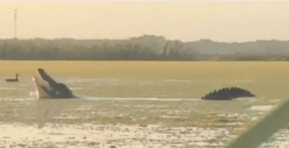 Con cá sấu kích thước khủng, trông như quái vật khổng lồ đang rình mò dưới nước và săn mồi. Phần đầu và thân thoắt ẩn thoắt hiện dưới làn nước giúp cá sấu tóm gọn con mồi mà không bị phát hiện. Video lan truyền cho thấy con cá sấu lướt qua mặt nước trước khi tóm gọn một con vịt.