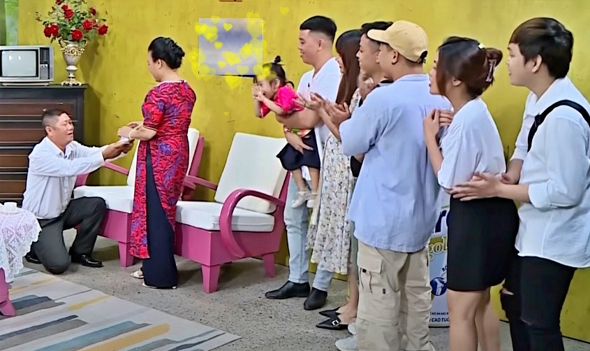 Cuối chương trình, trước mặt những người con, ông Tùng quỳ gối, tặng vợ chiếc nhẫn. Ông nhẹ nhàng đeo chiếc nhẫn vào tay vợ, điều ông chưa làm được trong ngày cưới của 2 người cách đây 29 năm.