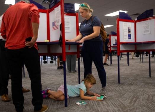 Bé gái nằm chơi dưới sàn nhà trong khi chờ mẹ bỏ phiếu trong cuộc bầu cử giữa kỳ ở Mỹ. Ảnh AP