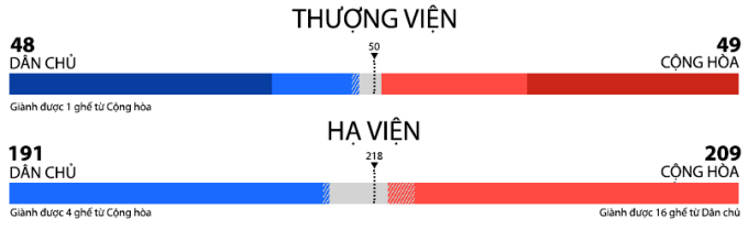 Đảng Cộng hòa đang giành 209 ghế nghị sĩ tại Hạ viện, còn đảng Dân chủ là 191 ghế. Một đảng cần tối thiểu 218 ghế để kiểm soát Hạ viện Mỹ.