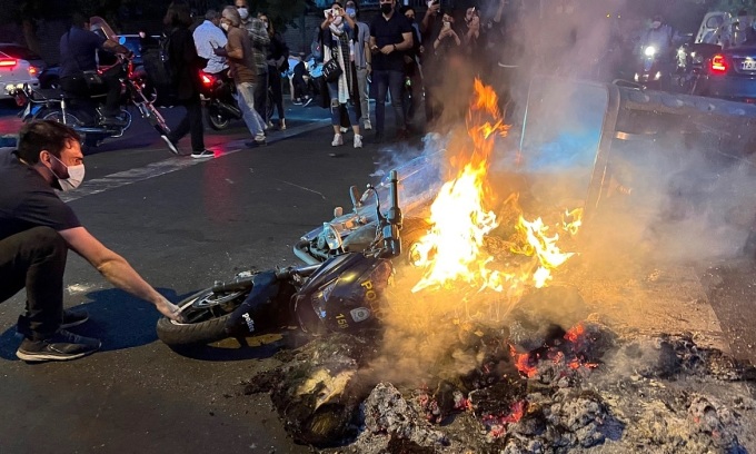 Người biểu tình Iran đốt xe máy của cảnh sát trong cuộc biểu tình tại Tehran ngày 25/9. Ảnh: AFP.