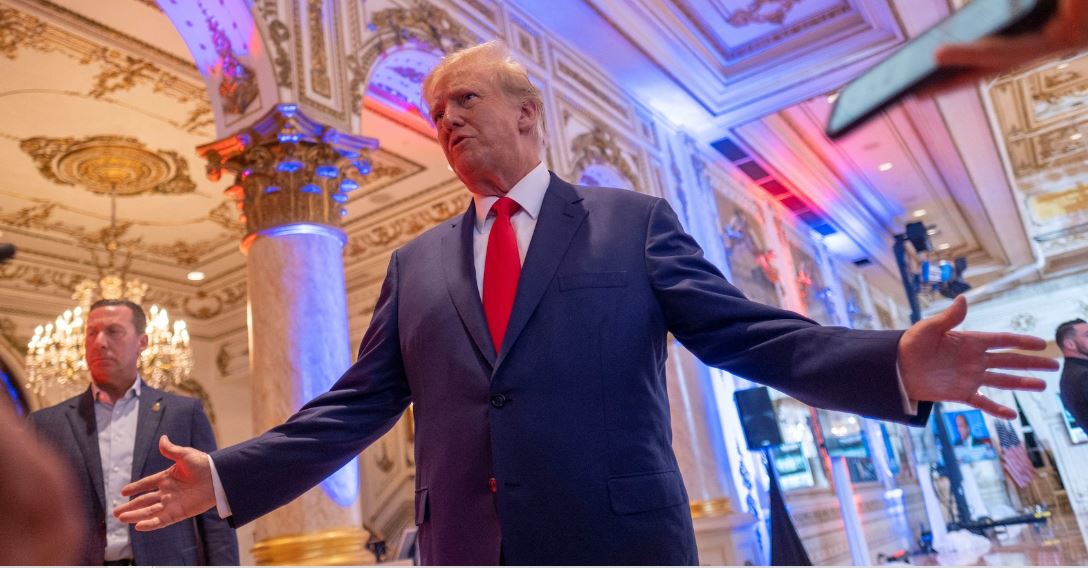Cựu Tổng thống Donald Trump nói chuyện với báo chí trong khuôn viên khu nghỉ dưỡng Mar-a-Lago vào đêm bầu cử giữa kỳ. Ảnh: Reuters.