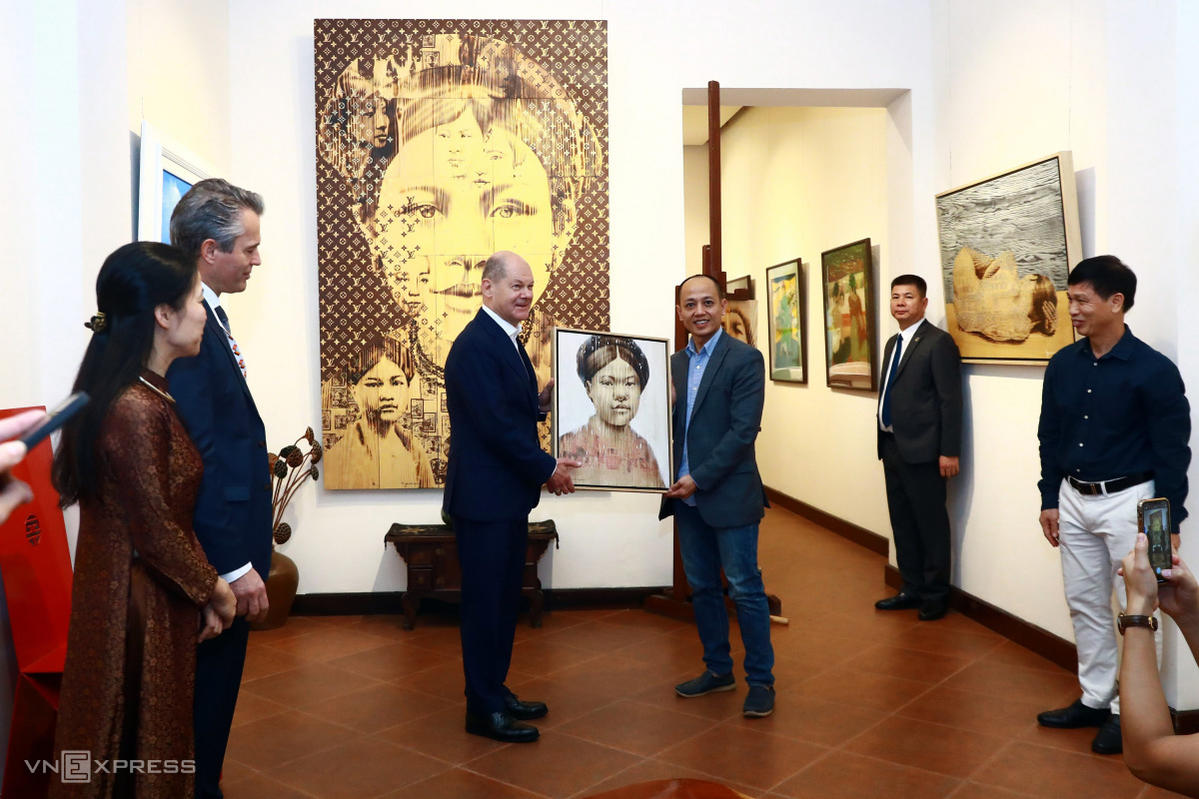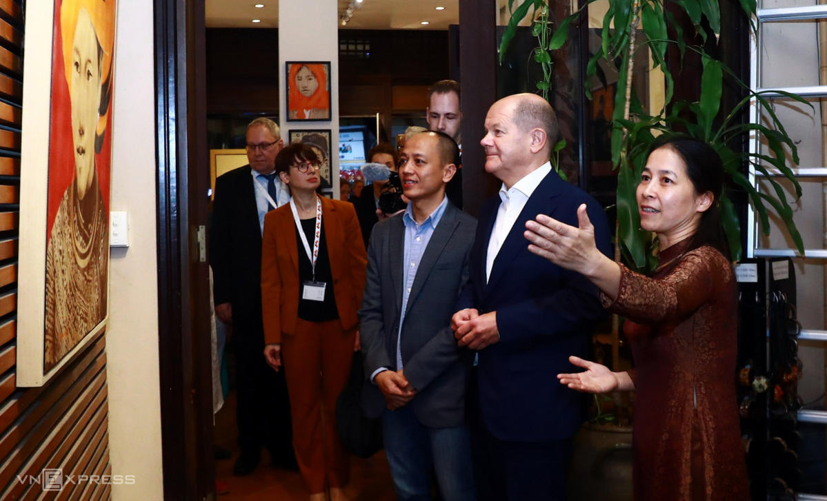 Thủ tướng Đức Olaf Scholz tối qua thăm phòng tranh tại phố Hàng Gai, Hà Nội, thưởng thức các tác phẩm nghệ thuật của những họa sĩ nổi tiếng và họa sĩ trẻ tài năng Việt Nam.