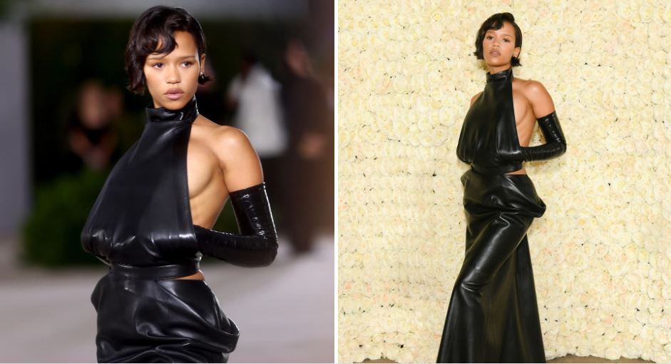 Nữ diễn viên thường diện các thiết kế từ thương hiệu Alexander McQueen. Mẫu váy da tông đen với loạt chi tiết cut-out là một trong những thiết kế táo bạo nhất mà Taylor Russell từng diện. Mẫu đầm được cô diện khi dự Academy of Motion Picture Arts and Sciences. Ảnh: Getty, Vogue.