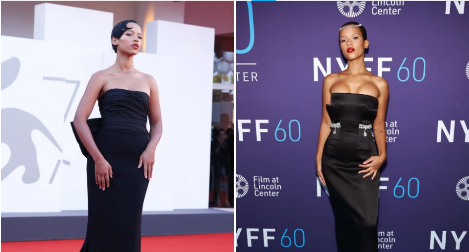 Váy cúp ngực giúp nhiều nghệ sĩ nhìn quyến rũ. Trong khoảnh khắc mặc thiết kế này, Taylor Russell thể hiện khía cạnh gợi cảm nhưng mạnh mẽ. Trang phục tông đen thêm