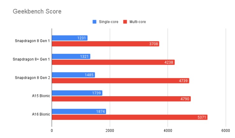 Tuy nhiên, điểm hiệu năng Geekbench được phát hiện trên một smartphone Android chạy Snapdragon 8 Gen 2 chưa phát hành cho thấy, mẫu chip này đạt 1.485 điểm đơn nhân và 4.739 điểm đa nhân. Trong khi đó, Apple A16 Bionic cao hơn hẳn với 1.874 điểm và 5.371 điểm tương ứng.