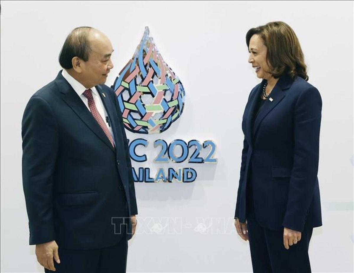 Sáng 18/11/2022, tại Bangkok, Thái Lan, Chủ tịch nước Nguyễn Xuân Phúc đã có cuộc gặp với Phó Tổng thống Hoa Kỳ Kamala Harris nhân dịp tham dự Tuần lễ cấp cao APEC.