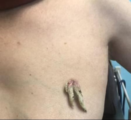 Người phụ nữ Malaysia, 63 tuổi, phát triển chiếc sừng kỳ lạ dài 5cm trên ngực. Người phụ nữ giấu tên, nói với các bác sĩ rằng sừng tự nhiên xuất hiện ở bên trái ngực từ cách đây hai năm. Vào thời điểm bà đến bệnh viện, chúng đã phát triển dài khoảng 5cm và khá ngứa ngáy.