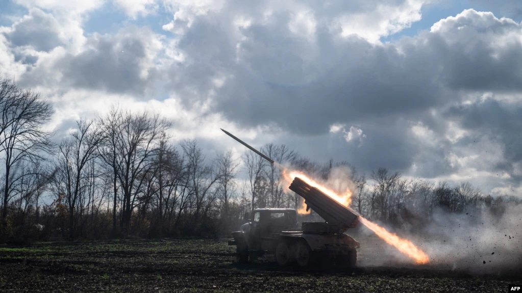 TƯ LIỆU - Một bệ phóng tên lửa đa nòng BM-21 'Grad' của Ukraine bắn một tên lửa về phía các vị trí của Nga trên tiền tuyến ở khu vực Kharkiv, ngày 3 tháng 11 năm 2022.
