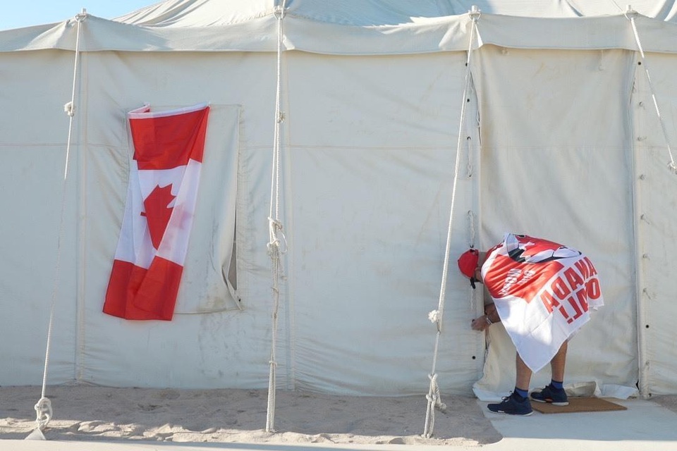 Một người hâm mộ Canada đóng lều tại làng cổ động viên Al Khor hôm 23/11. Ảnh: AP.