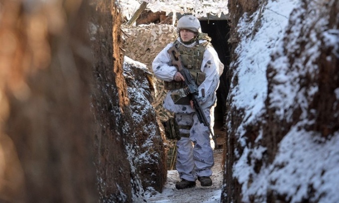 Lính Ukraine trong chiến hào tại một vị trí chiến đấu bên ngoài khu định cư Zaitseve ở khu vực miền đông Donetsk, hồi tháng 2. Ảnh: Reuters.