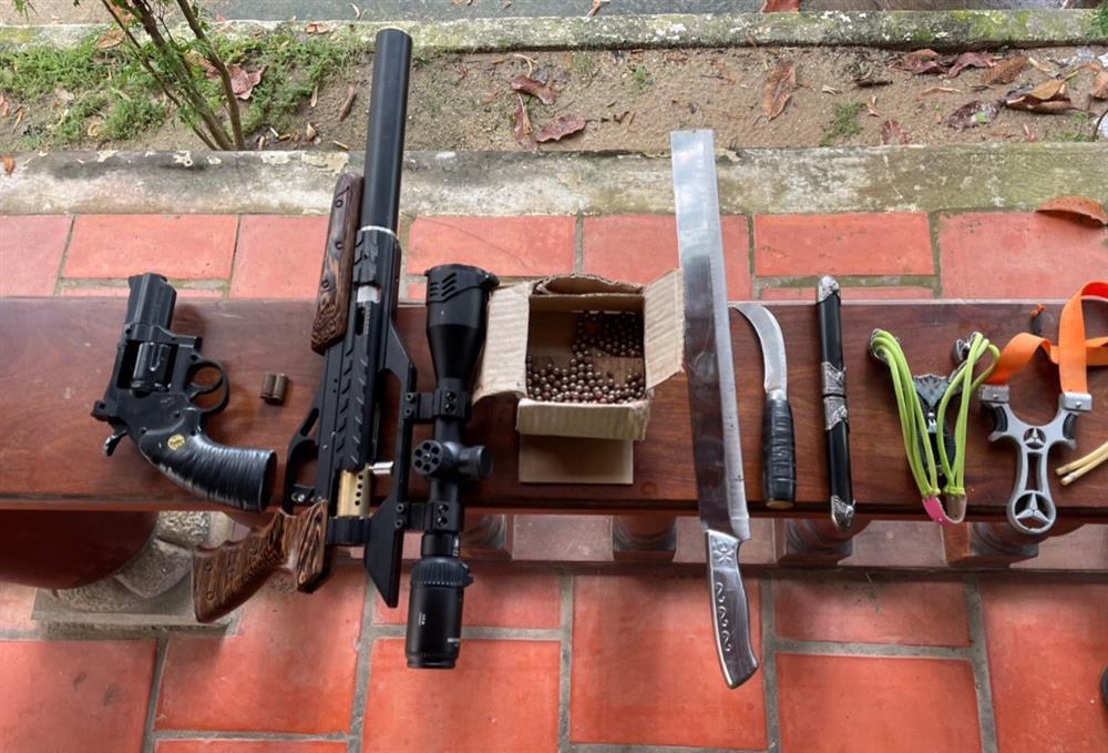 Tang vật bị thu giữ bao gồm 1 súng rulo bắn đạn cao su; 1 súng bắn đạn bi; 1 mã tấu; 1 dao quắn; 1 dao rút; nhiều viên đạn bi và 2 viên đạn cao su; 3 xe mô tô độ pô…