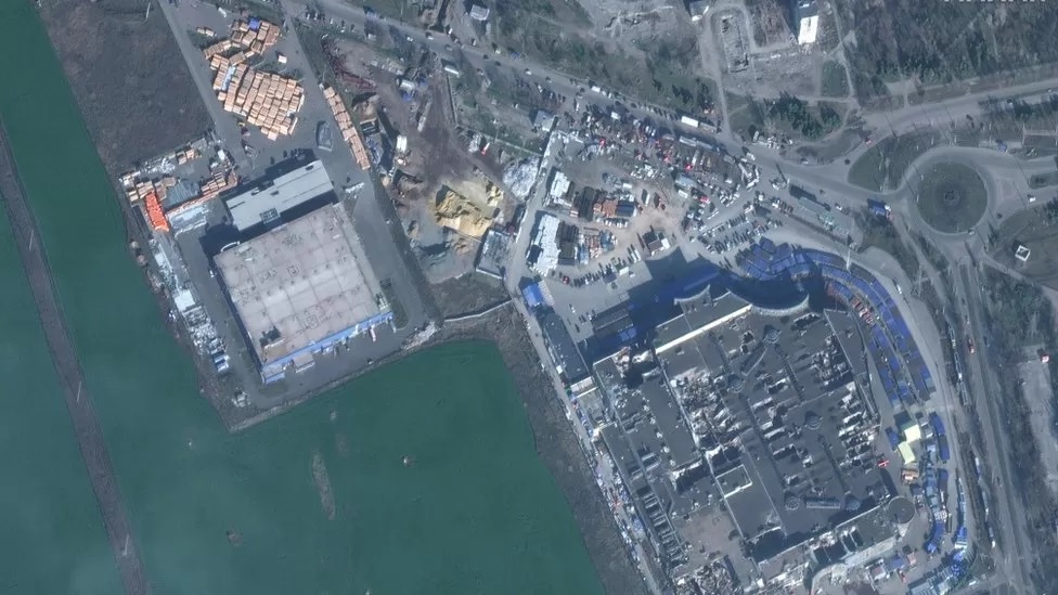 Hình ảnh cho thấy vật tư xây dựng tại trung tâm mua sắm của Mariupol. Ảnh BBC/Maxar