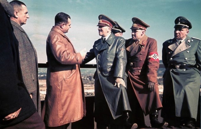 Martin Bormann (đeo băng tay) đứng sau Adolf Hitler trong một sự kiện năm 1943. Ảnh: Tradera