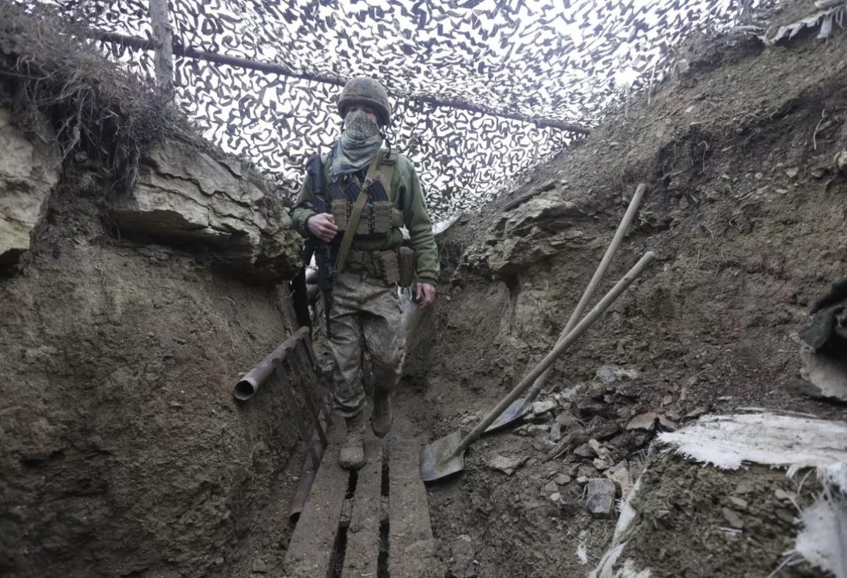 Một binh lính Ukraine đi bộ trong chiến hào ở Debaltesvo. Ảnh: AP