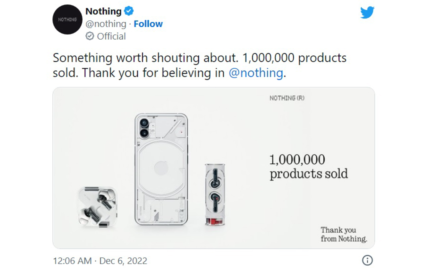 Nothing, Startup do Carl Pei - đồng sáng lập OnePlus thành lập đã thông báo rằng. Họ đã đạt được một cột mốc quan trọng đó là bán được 1 triệu sản phẩm. Bao gồm cả tai nghe Ear (1), Ear (Stick) và điện thoại Phone (1)) sau hơn 1 năm kể từ khi ra mắt sản phẩm đầu tiên.