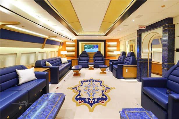 Được hoàn thiện với tông màu trang trí chủ đạo là màu xanh lam, trắng và vàng, chiếc Boeing 747-8 toát lên vẻ sang trọng trong từng chi tiết. Đây vốn là một chiếc máy bay khổng lồ chứ không phải là kiểu máy bay riêng tư nhân thường có kích thước nhỏ hơn. Kích thước của nó tương đương với máy bay thương mại chở được 467 hành khách. Hầu hết số ghế ngồi ban đầu của máy bay đã được loại bỏ để tối đa hóa không gian.
