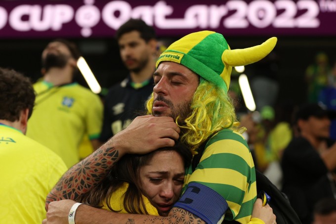 CĐV Brazil an ủi nhau trên khán đài sân Education City sau thất bại của đội tuyển trước Croatia tại tứ kết, ngày 9/12. Ảnh: AFP.
