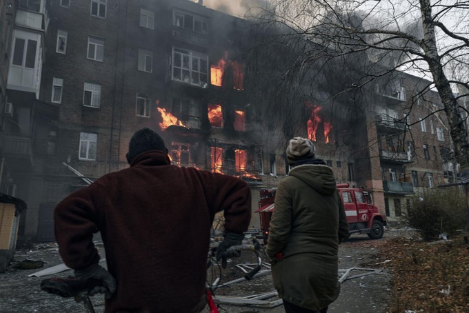 Người dân Bakhmut đứng bên ngoài một khu chung cư đang cháy sau trận pháo kích của quân đội Nga (Ảnh: AP).