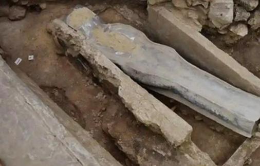 Quan tài không có bia mộ. Những lỗ thủng xung quanh đầu hài cốt cho thấy hài cốt đã tiếp xúc với không khí và bị hư hỏng nghiêm trọng.