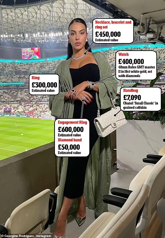 Sau sự xuất hiện gây "lóa mắt" của Georgina Rodriguez, các chuyên gia nữ trang đã ước tính cô mang số trang sức trị giá hơn 50 tỷ đồng đi xem World Cup (Ảnh: Daily Mail).