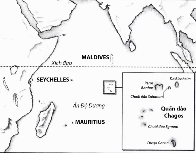 Đảo Diego Garcia, quần đảo Chagos và quốc đảo Mauritus trên Ấn Độ Dương. Đồ họa: Granta.