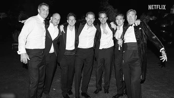 Harry bên một nhóm khách mời nam trong đám cưới năm 2018. Ảnh: Netflix