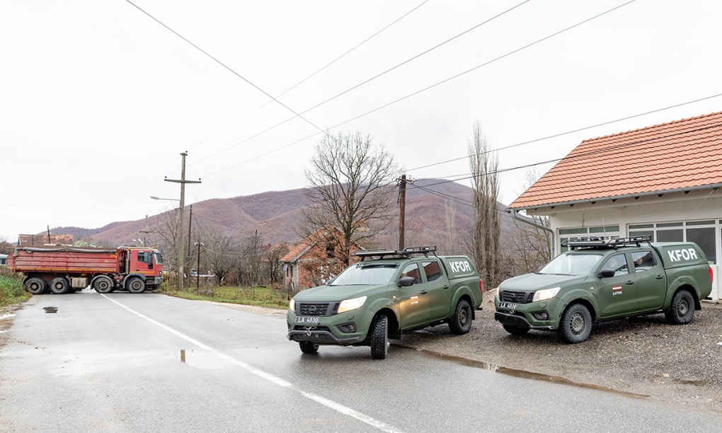 Binh sĩ Latvia thuộc lực lượng KFOR của NATO trên tuyến đường bị người Serbia dùng xe tải phong tỏa ở Kosovo ngày 15/12. Ảnh: AFP.
