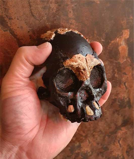 Hộp sọ tương đối rõ ràng đầu tiên của "loài người ma" Homo naledi được phục dựng từ những mảnh hài cốt hiếm hoi của một đứa trẻ. Chỉ có các phần màu nâu nhạt là hài cốt thực, màu đen là vật liệu thay thế - Ảnh: Đại học Witwatersrand
