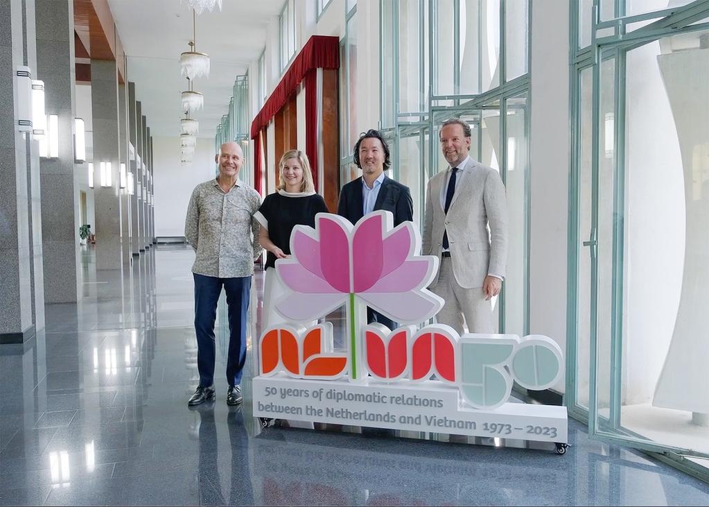 Arjen Ijff (thứ hai từ phải sang) chụp ảnh cùng chiếc logo kết hợp hoa sen và hoa tulip. Ảnh: NVCC.