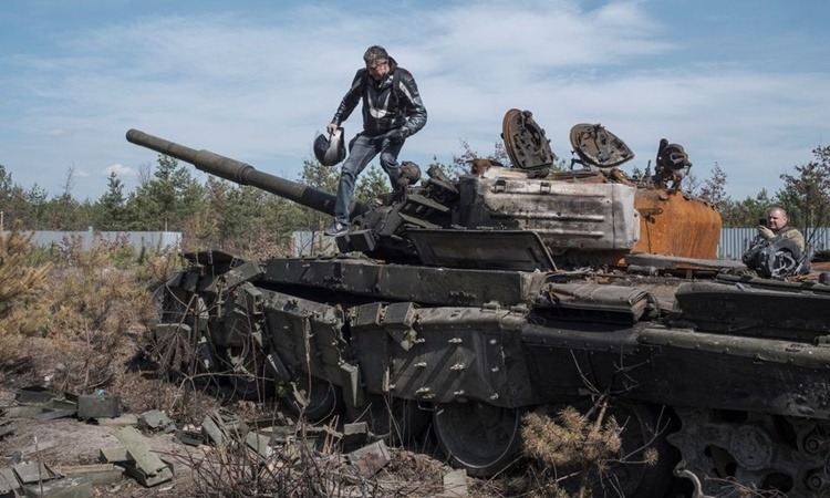 Một chiếc xe tăng Nga bị bỏ lại ở ngoại ô thủ đô Kiev, Ukraine, hồi tháng 4. Ảnh: Reuters.