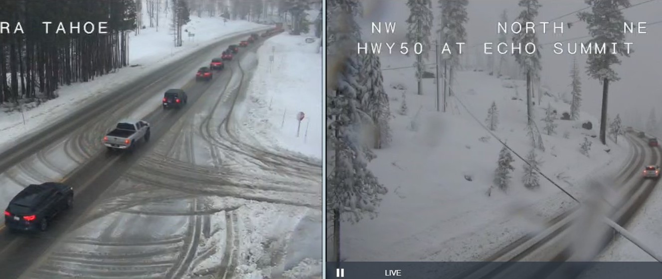 Xe cộ chạy qua đèo Echo Summit ở California hôm thứ Ba, 27 tháng Mười Hai. (Hình: Caltrans)