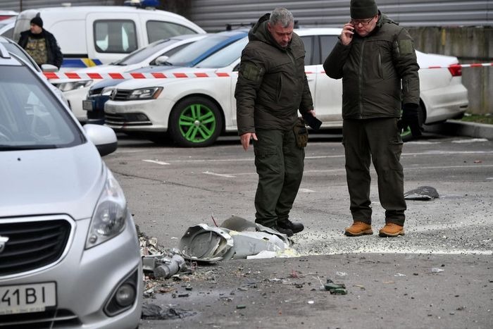 Lực lượng an ninh Ukraine xem xét một mảnh vỡ tên lửa rơi ở Kiev. Nguồn: AFP/Getty