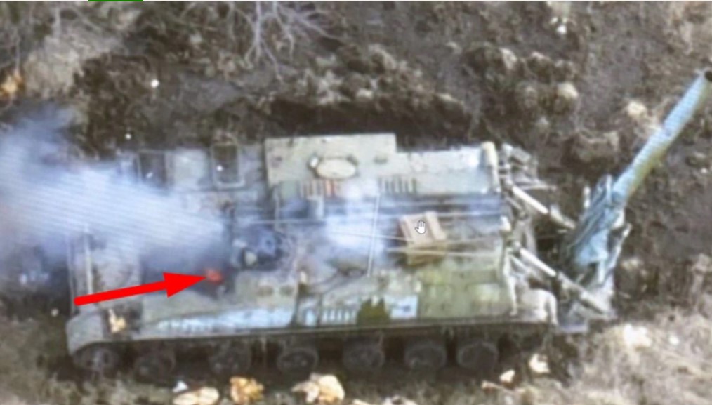 Theo một số nguồn tin, pháo tự hành này đã bị loại khỏi vòng chiến đấu sau khi bị các máy bay không người lái Ukraine thả chất nổ tấn công từ trên cao.