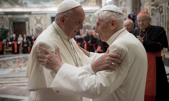 Cựu giáo hoàng Benedict (phải) và Giáo hoàng Francis tại lễ kỷ niệm 65 năm ông Benedict được thu phong linh mục vào ngày 28/6/2016, tại Vatican. Ảnh: Reuters.