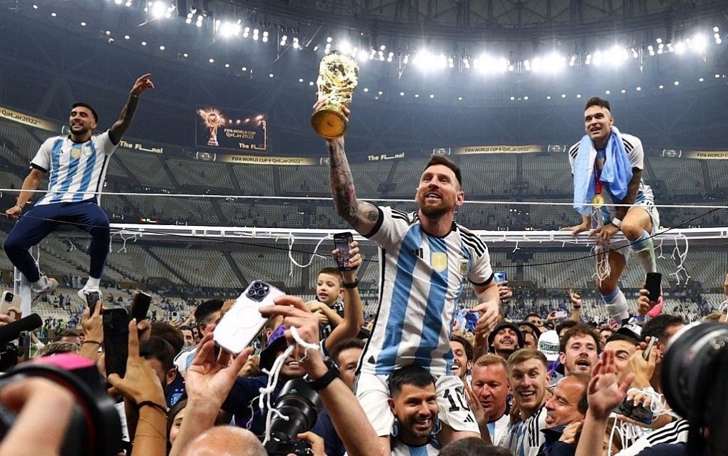 Trong bức ảnh lập kỷ lục gần 75 triệu lượt like, đội trưởng tuyển Argentina cầm chiếc cup giả do CĐV mang xuống từ khán đài.