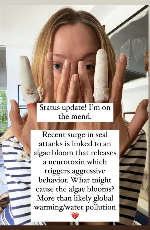 Trên tài khoản cá nhân, Taylor đăng ảnh đôi tay băng bó và tiết lộ bị hải cẩu cắn 6 cái. Cô phải nhập viện cấp cứu và dùng thuốc kháng sinh mạnh.