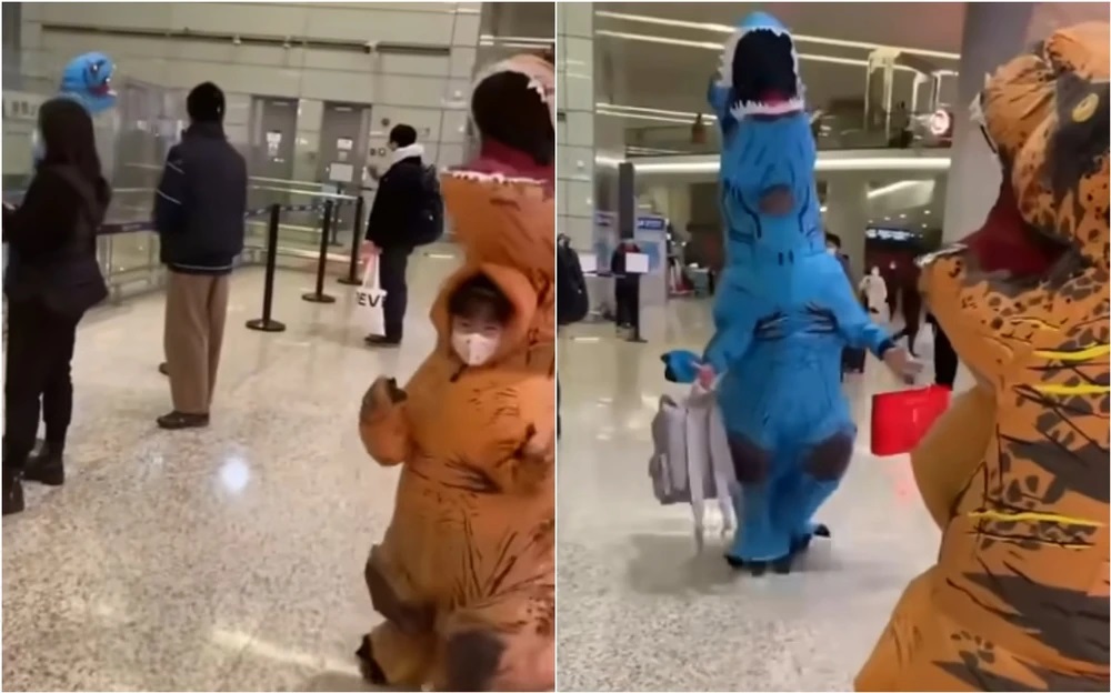Theo như sự đáp lại sự đáng yêu của người con gái, ngay sau khi xuống máy bay để gặp ông bố nhưng ông bố cũng diện một bộ đồ khủng long xanh, sau khi người con gái nhất định đòi mặc bộ đồ khủng long vàng đi đón bố ở sân bay về cảnh tượng vô cùng đáng yêu của 2 bố con khiến cả sân bay cười xỉu.