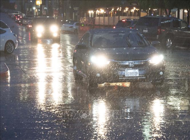 Các phương tiện di chuyển trong mưa lớn do ảnh hưởng của bão ở Millbrae, California, Mỹ ngày 4/1/2023. Ảnh: THX