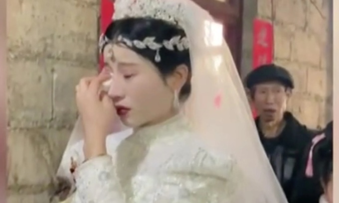 Cô dâu 20 tuổi bật khóc trong đám cưới ở tỉnh Quý Châu, tây nam Trung Quốc. Ảnh: Baidu.
